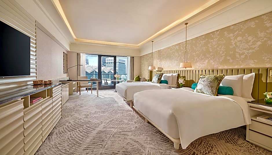 This air-conditioned twin suite features a private patio and floor-to-ceiling quadruple-glazed windows that open up to panoramic views of the bay and the Singapore skyline. Separated by wood doors, the living room is furnished with cream-colored armchairs and dark wooden tables. The bedroom feature a selection of Oriental artifacts. The private bathroom includes a walk-in shower, a bath and a powder room.